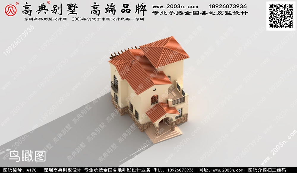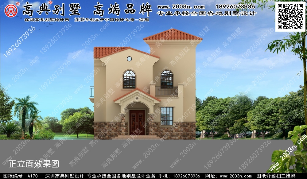 明黄色涂料、咖啡色涂料、铁艺栏杆、欧式水泥构件线条、屋面西班牙瓦