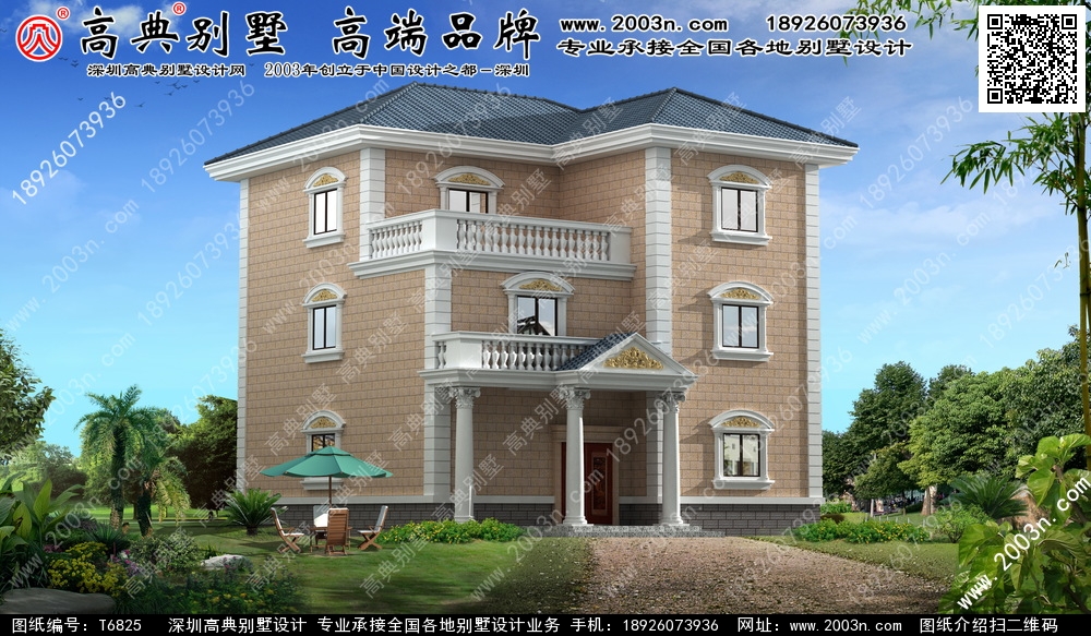 t6825号别墅外墙主要建筑材料:天然岩石漆、300X600仿石材外墙砖、CRC浮雕、310X310 S瓦、GRC水泥构件窗套及包边