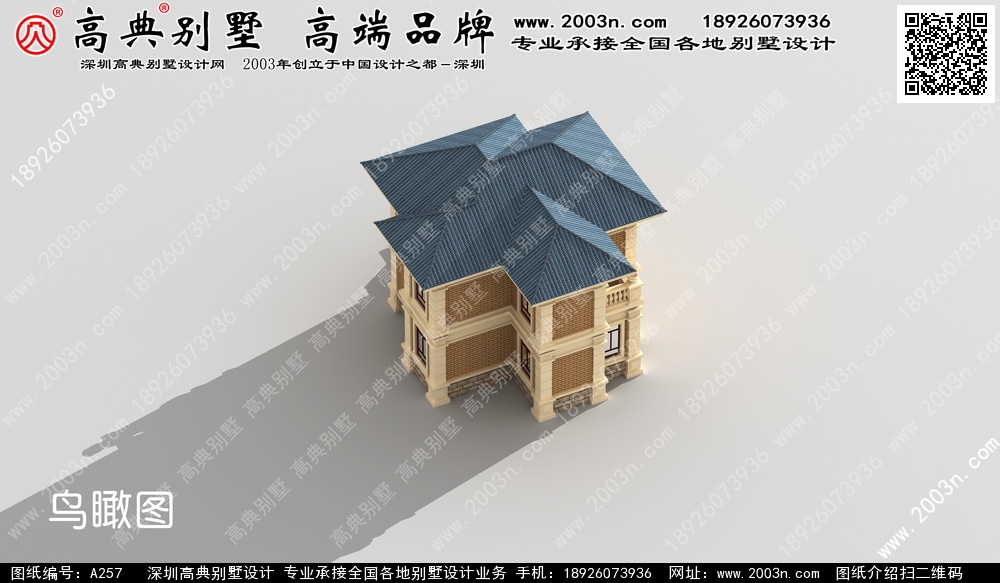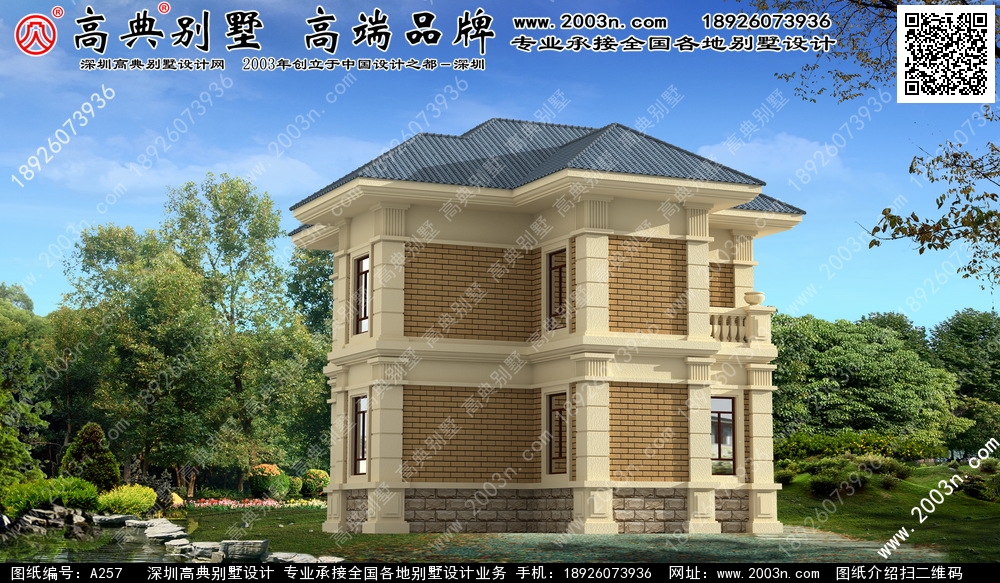 A257号别墅外墙主要材料:310X310S瓦、真石漆、蘑菇面黄锈石、水泥构件、外墙劈开砖