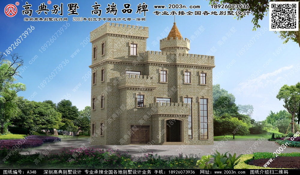 A348号别墅外墙主要材料: 天然岩石漆、外墙文化石、蘑菇面黄锈石、欧式水泥构件线条、屋面玻纤瓦