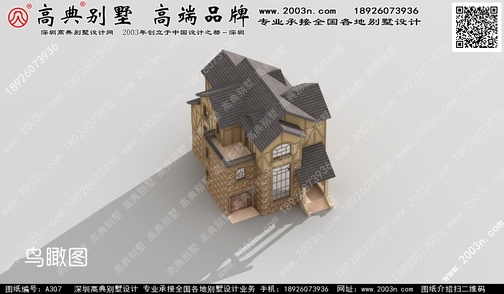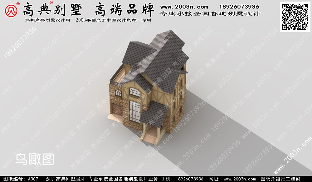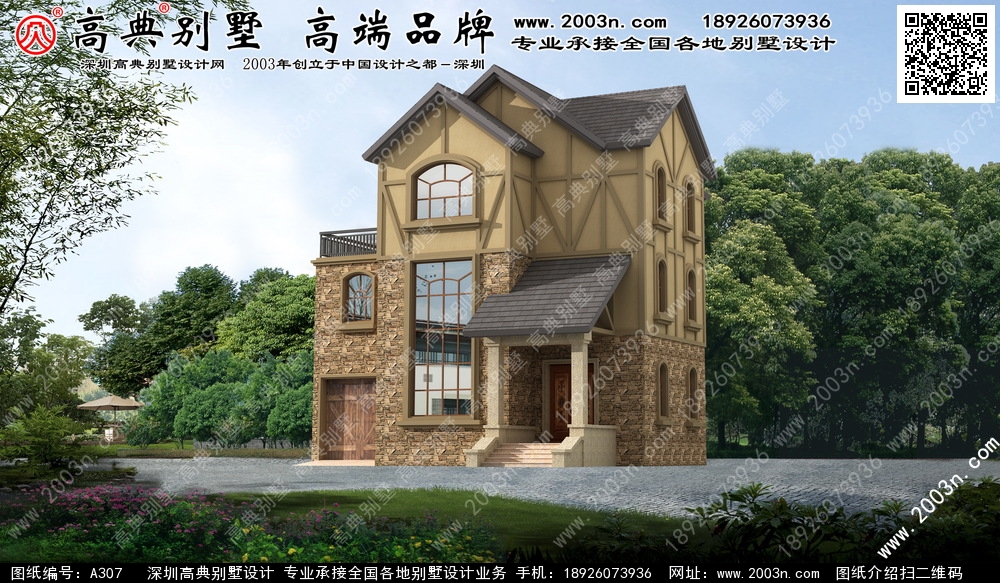 A307号别墅外墙主要材料:真石漆、铁艺栏杆、水泥构件墙面装饰线条、文化石、屋面水泥平板瓦