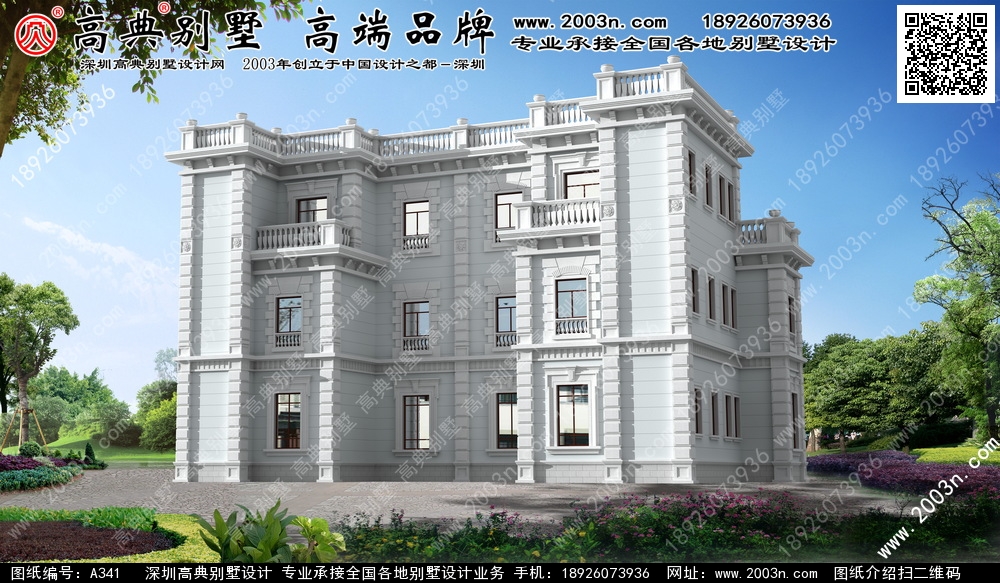 A341号别墅此别墅外墙主要材料:天然岩石漆、水泥构件葫芦柱栏杆、白麻石、欧式水泥构件线条