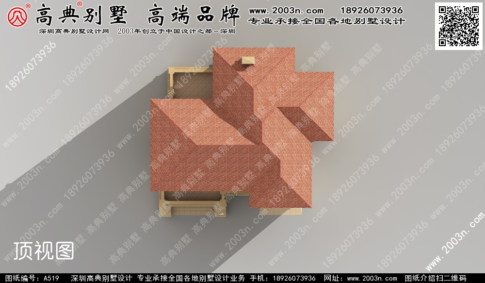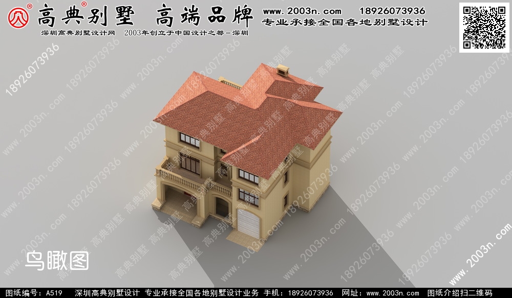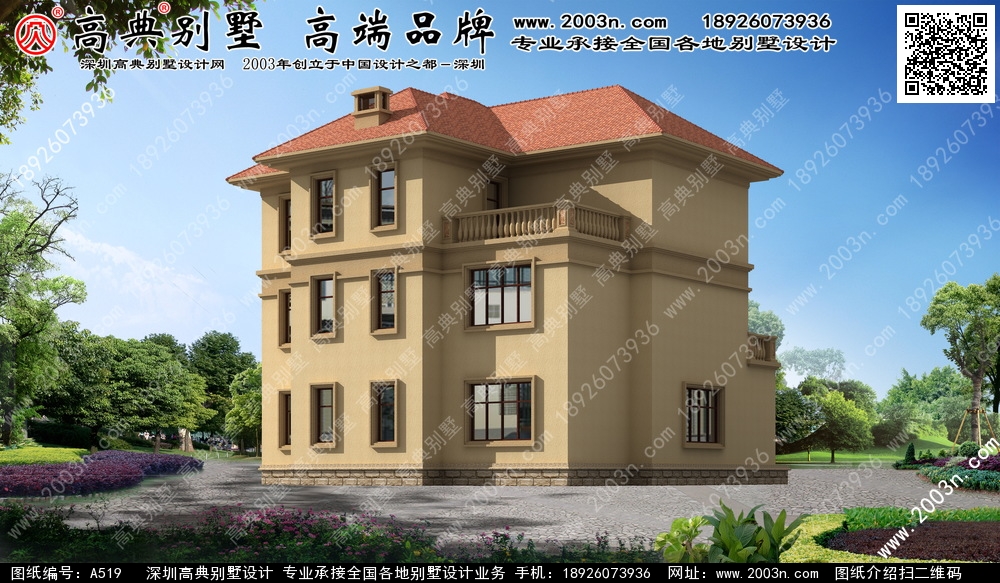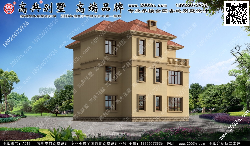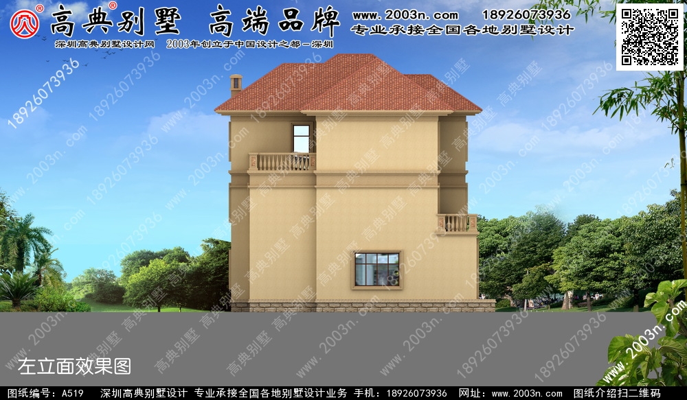 A519号别墅外墙主要材料:外墙真石漆、水泥构件墙面装饰线条、墙脚黄锈石、多色西班牙筒瓦