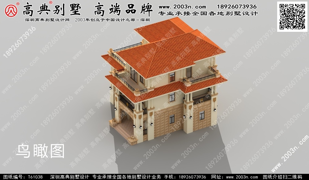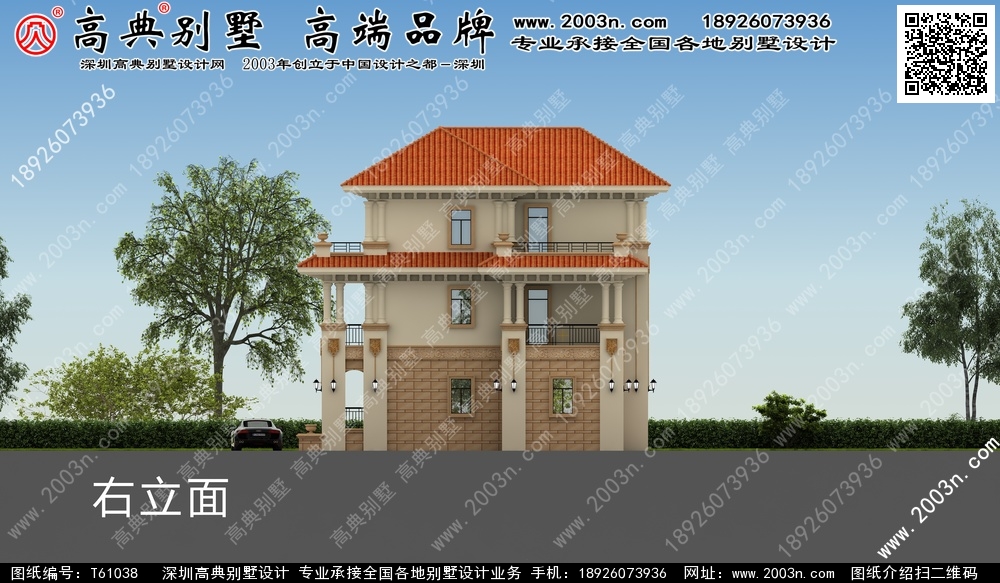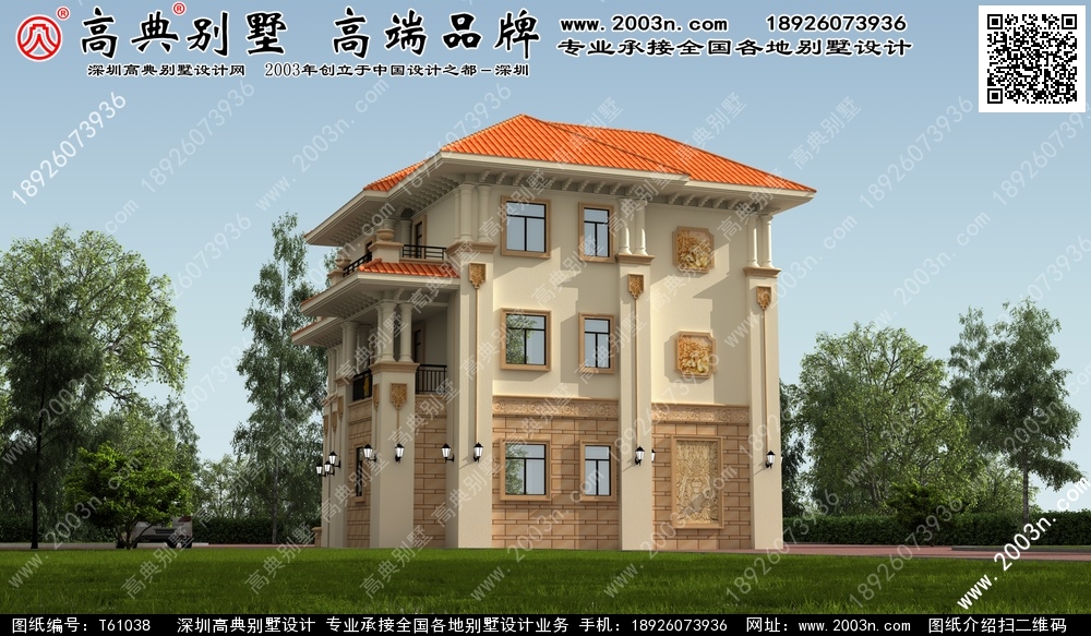 t61038号别墅外墙材料:天然岩石漆、天然砂岩石板材、天然砂岩石浮雕、310X310 S瓦、GRC水泥构件、铁艺栏杆