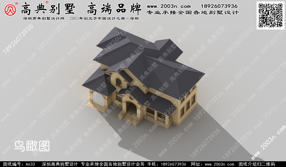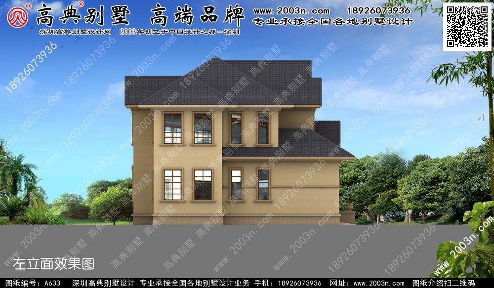 A633号别墅外墙主要材料:外墙真石漆、荔枝面黄锈石、屋面水泥平板瓦