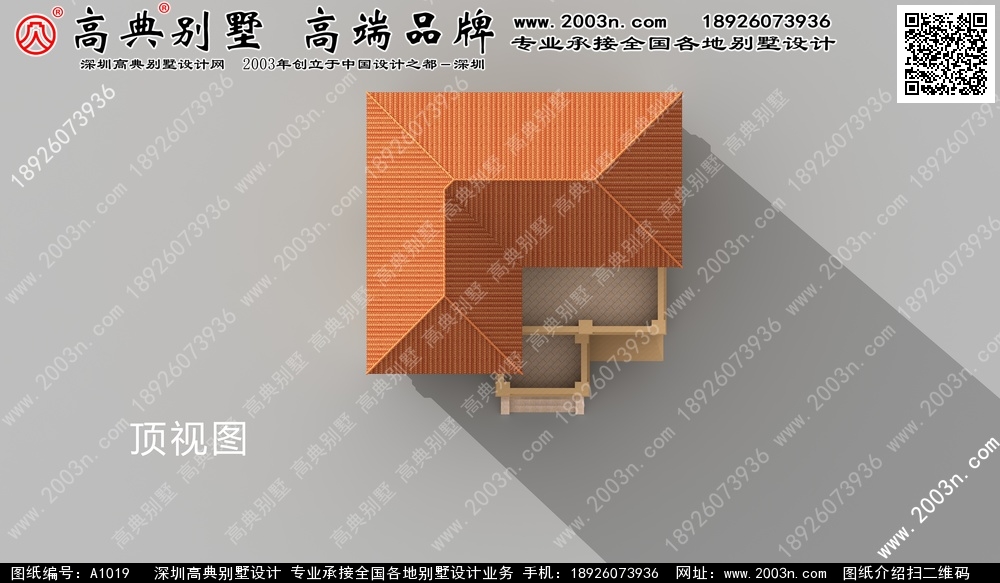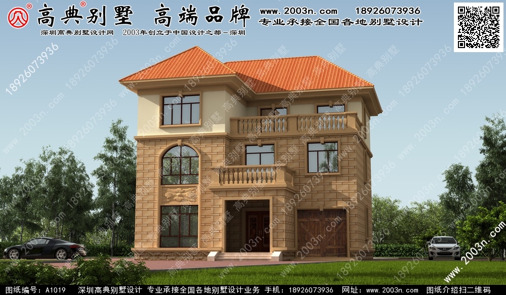 A1019号别墅外墙主要材料:蘑菇面黄锈石、外墙砖、真石漆、水泥平板瓦