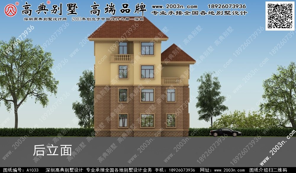 A1033号别墅外墙主要材料:蘑菇面黄锈石、劈开砖、真石漆、水泥平板瓦