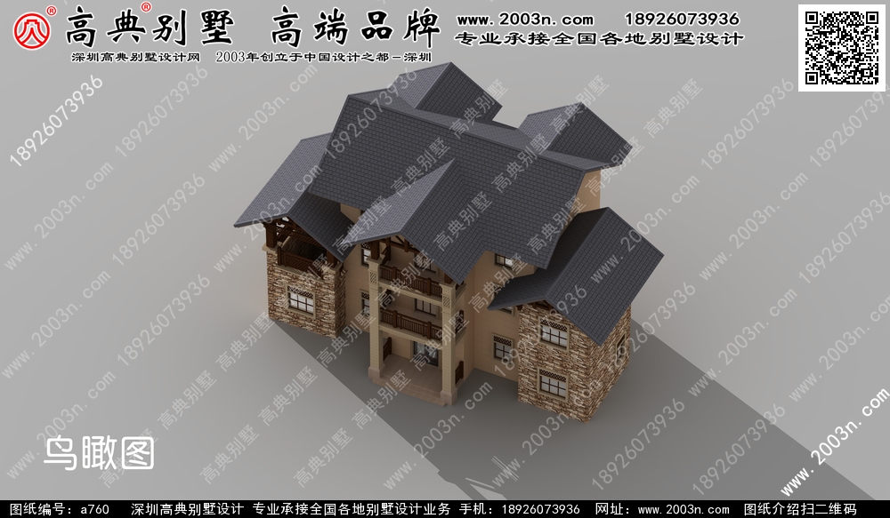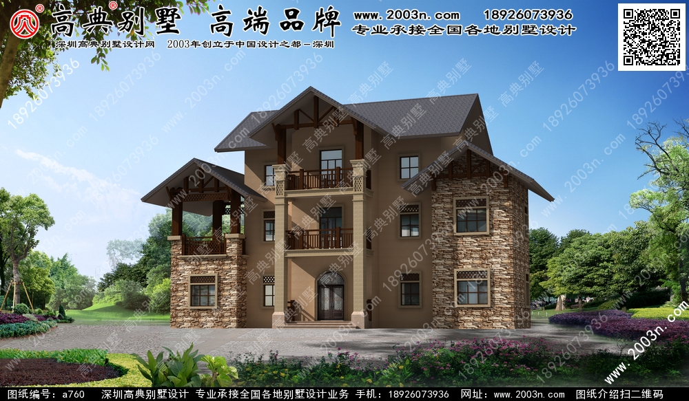此别墅外墙主要材料:真石漆、实木栏杆、文化石、水泥平板瓦