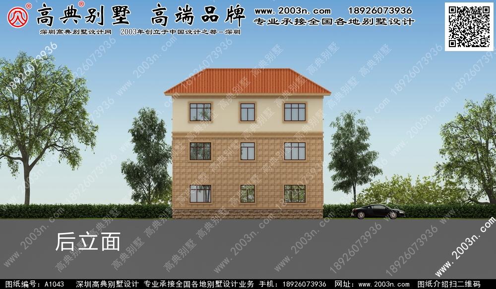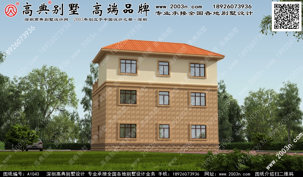 A1043号别墅外墙主要材料:真石漆、310X310S瓦、外墙砖、水泥构件、葫芦柱栏杆