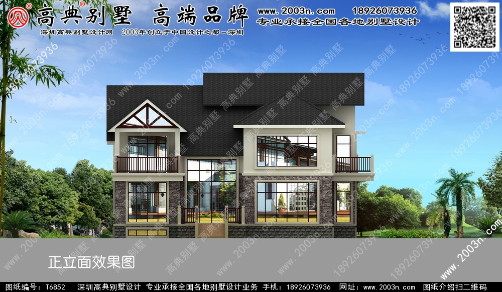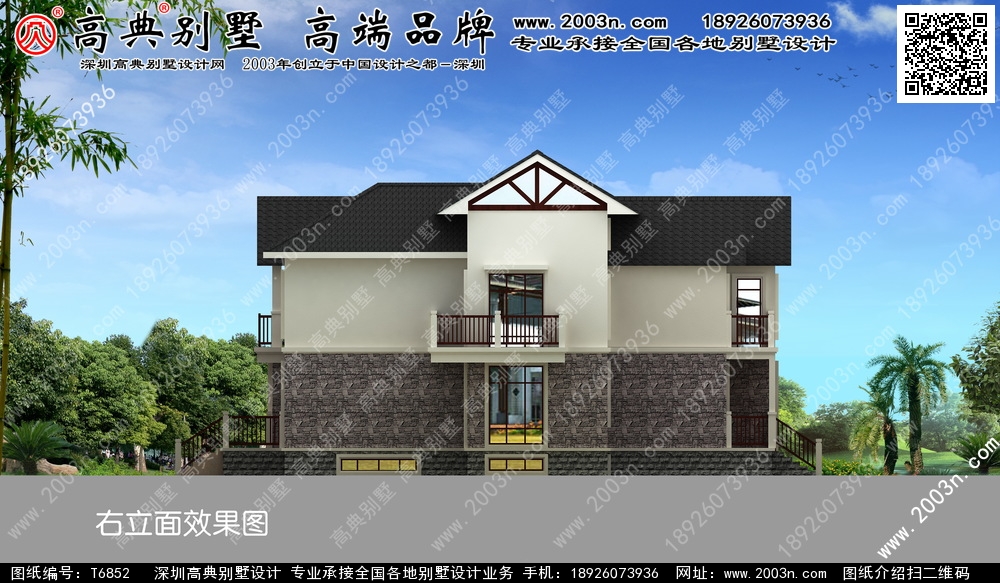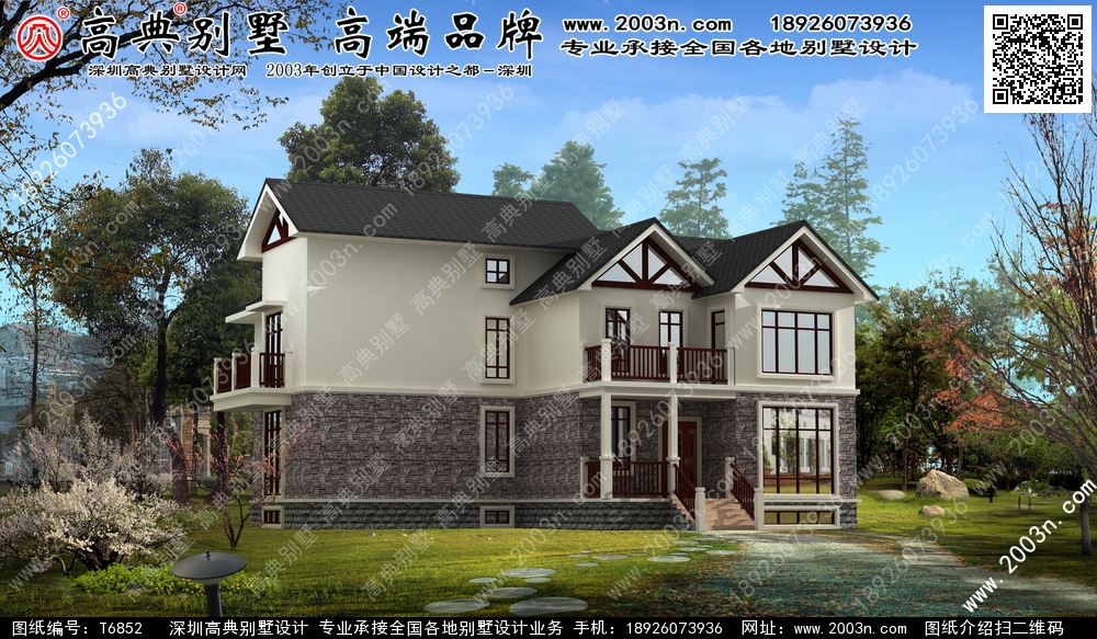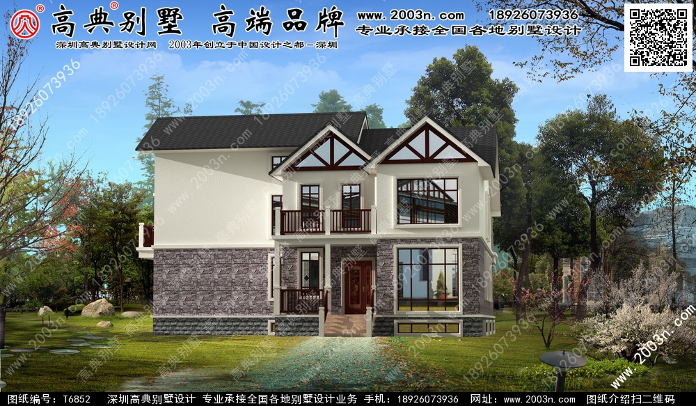t6852号别墅外墙主要材料:外墙涂料、屋面玻纤瓦、实木栏杆、外墙文化石、墙裙蘑菇石