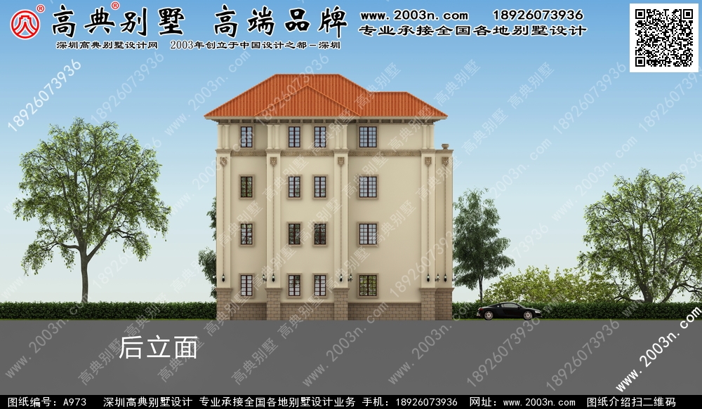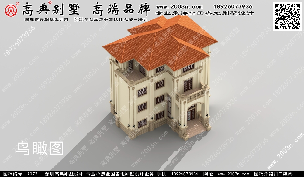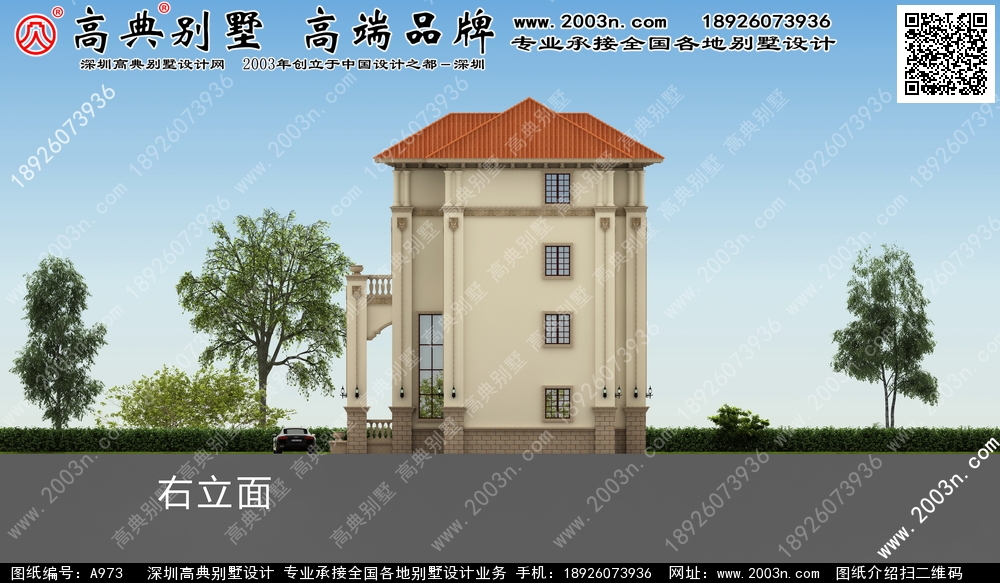 A973号别墅外墙主要材料:真石漆、310X310S瓦、火烧面黄锈石
