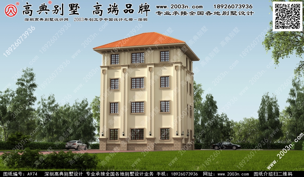 A974号别墅外墙主要材料:真石漆、310X310S瓦、荔枝面黄锈石