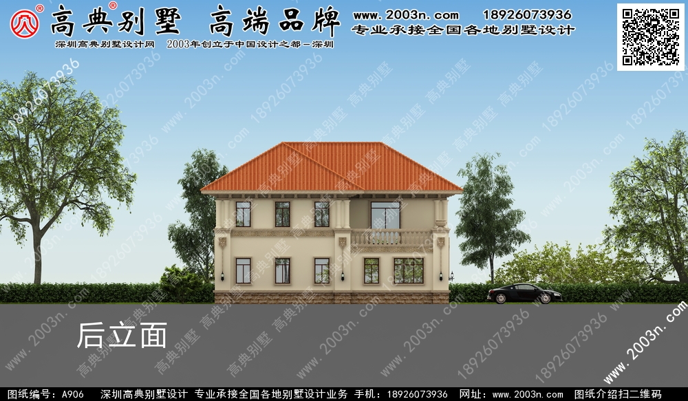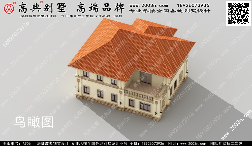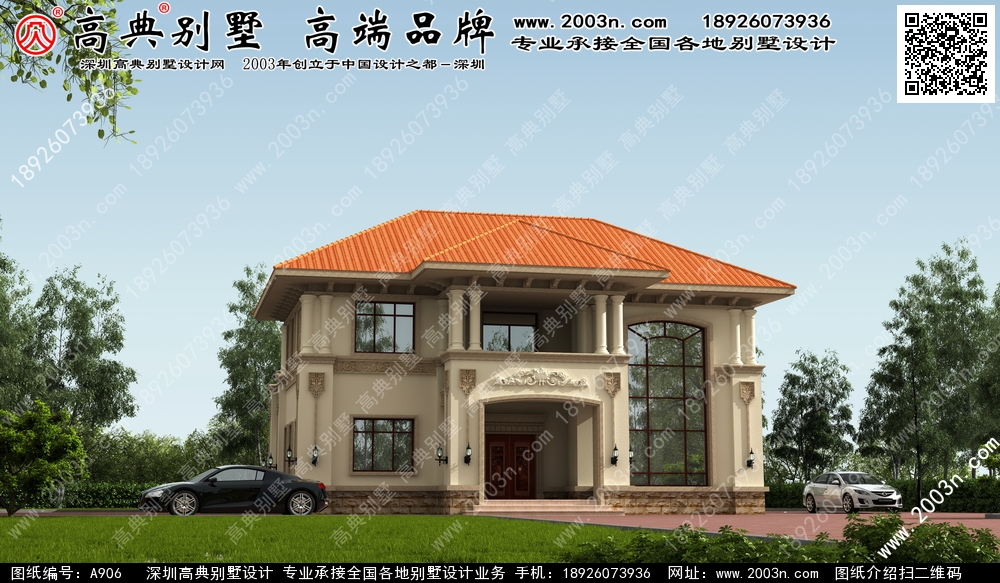 A906号别墅外墙主要材料:真石漆、310X310S瓦、蘑菇面黄锈石、葫芦栏杆、水泥构件斗拱、成品浮雕