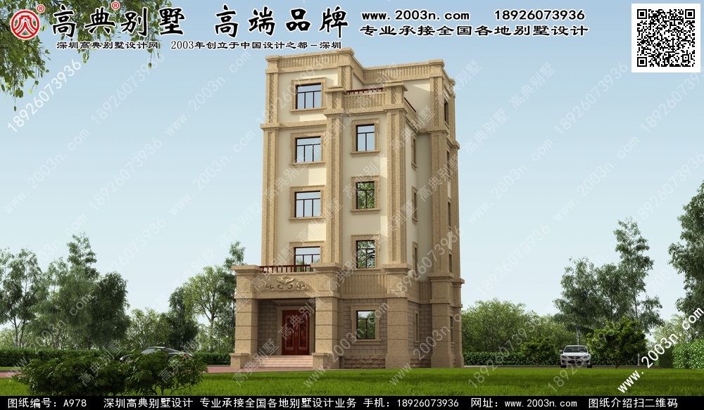 A978号别墅外墙主要材料:真石漆、黄锈石、黄锈石石材包边、水泥构件