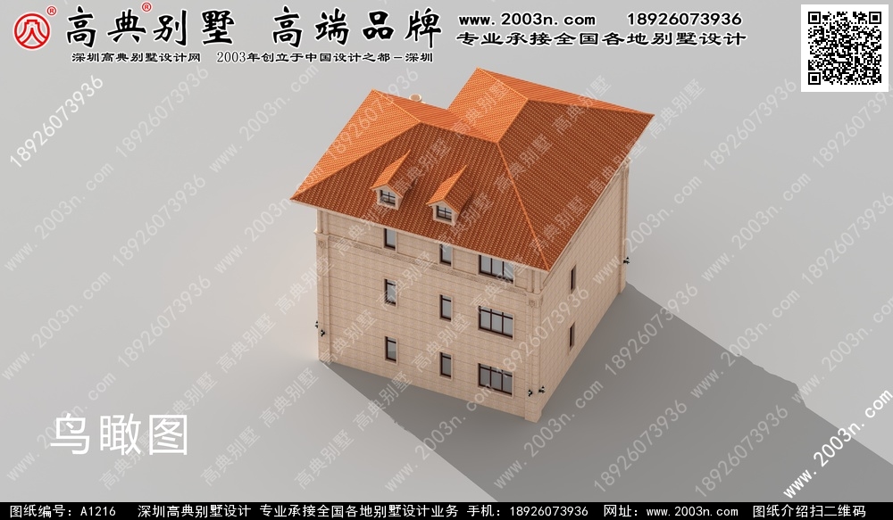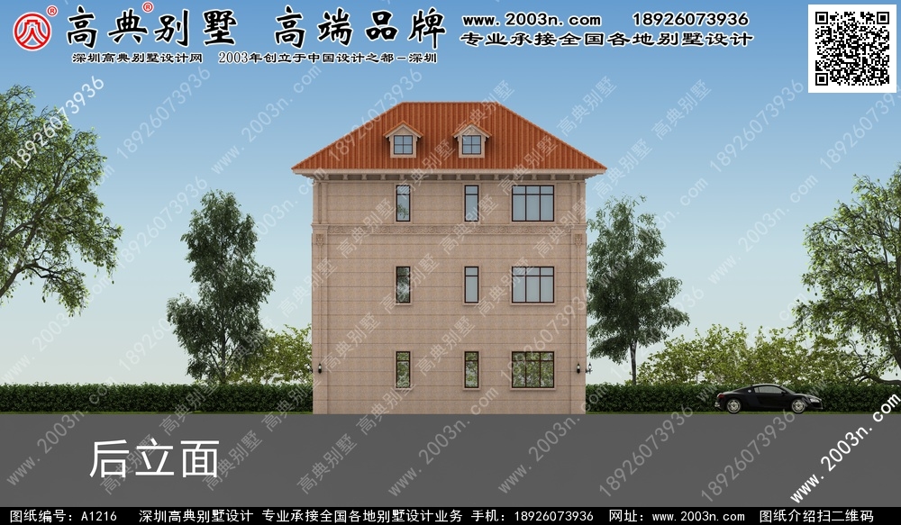 A1216号别墅外墙主要材料:外墙纯石材干挂、火烧面福建瑕红石材、310X310S瓦