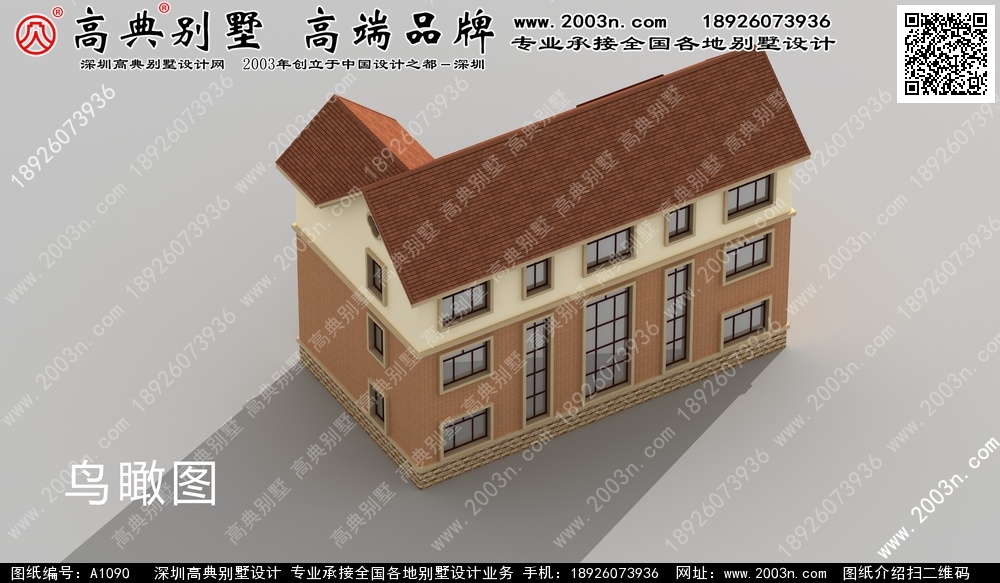 A1090号别墅外墙主要材料:蘑菇面黄锈石、劈开砖、真石漆、、水泥平板瓦、铁艺栏杆