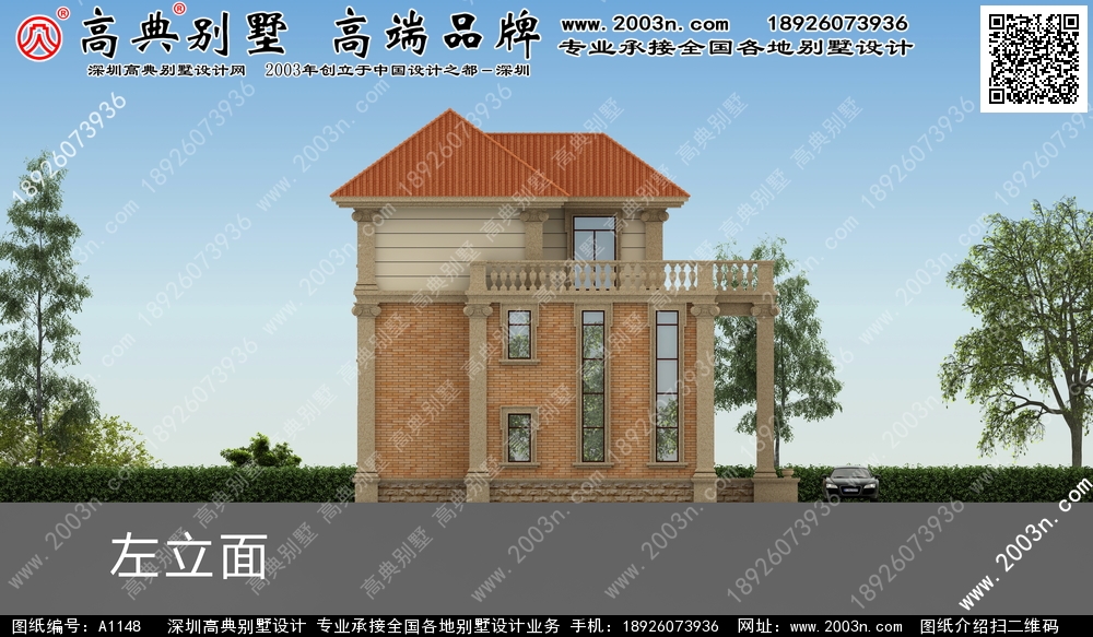 A1148号别墅外墙主要材料:水泥构件、蘑菇面黄锈石、劈开砖、真石漆、屋面310X310S瓦
