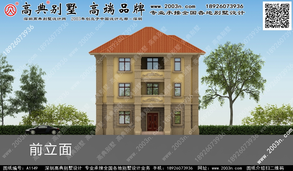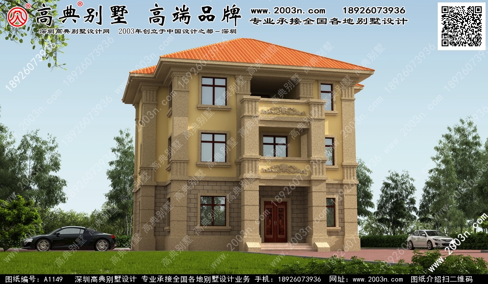 A1149号别墅外墙主要材料:荔枝面黄锈石、真石漆、310X310S瓦
