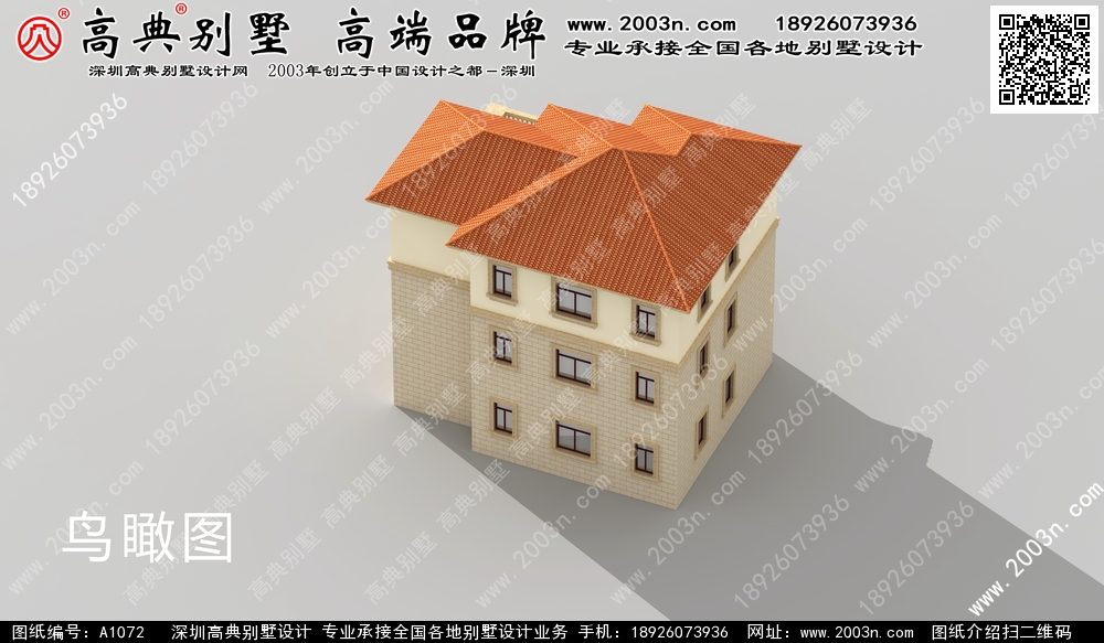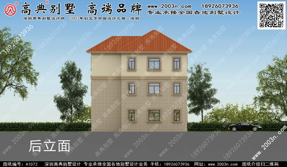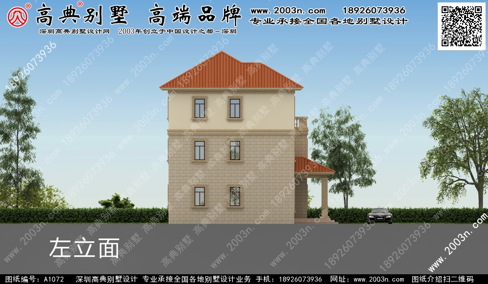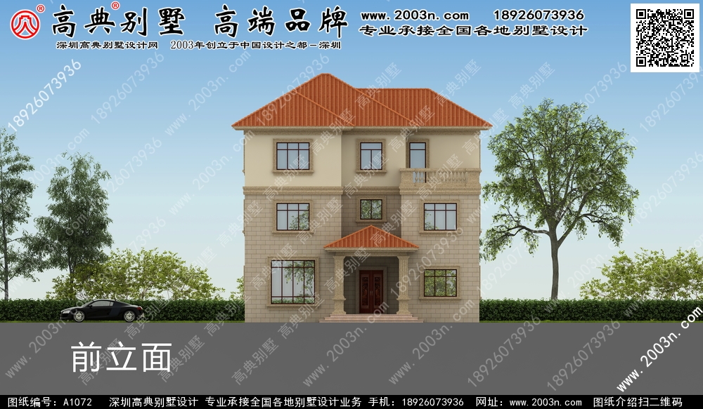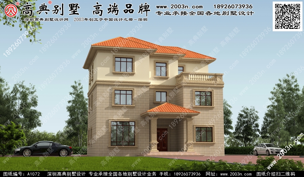 A1072号别墅外墙主要材料:真石漆、外墙砖、水泥构件、葫芦柱栏杆、310X310S瓦