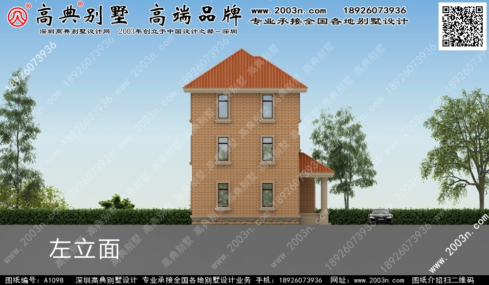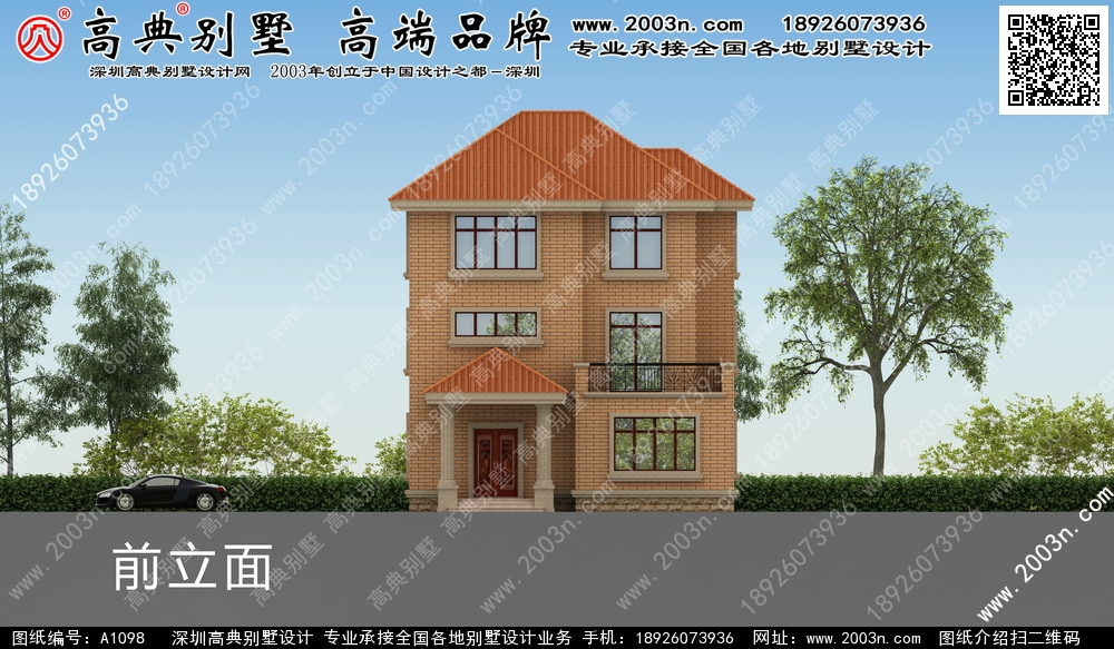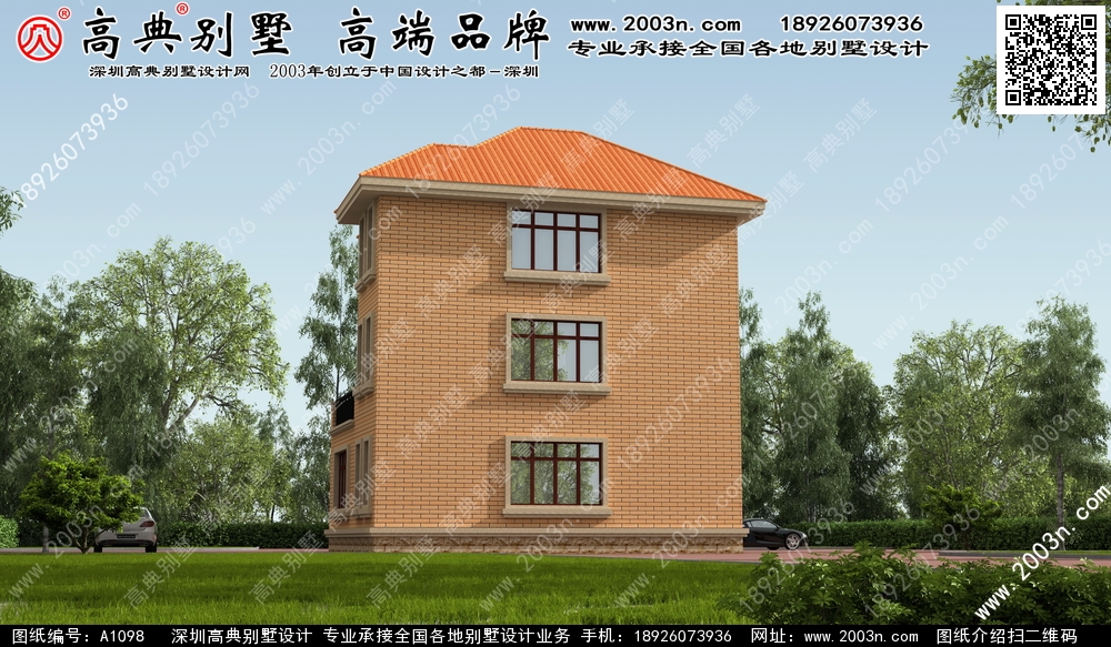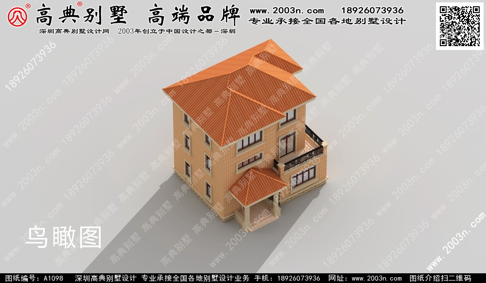 A1098号别墅外墙主要材料:蘑菇面黄锈石、天然岩石漆、劈开砖、铁艺栏杆、屋面310X310S瓦