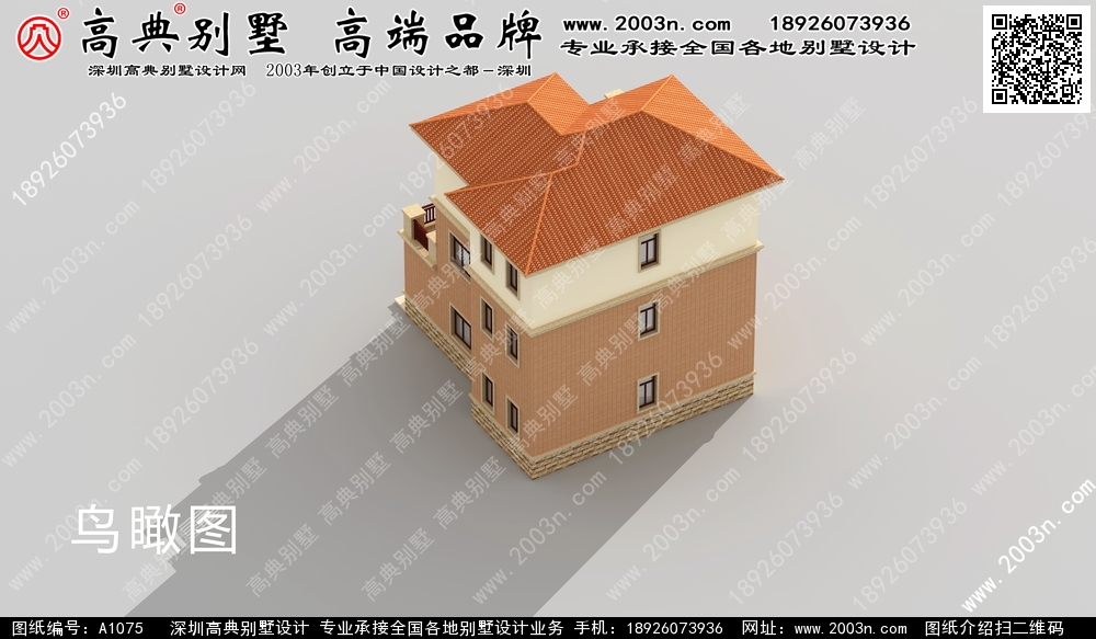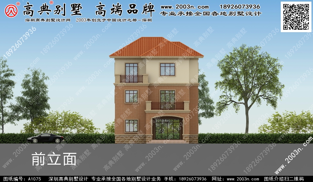 A1075号别墅外墙主要材料:真石漆、外墙劈开砖、铁艺栏杆、水泥构件、蘑菇面黄锈石、310X310S瓦