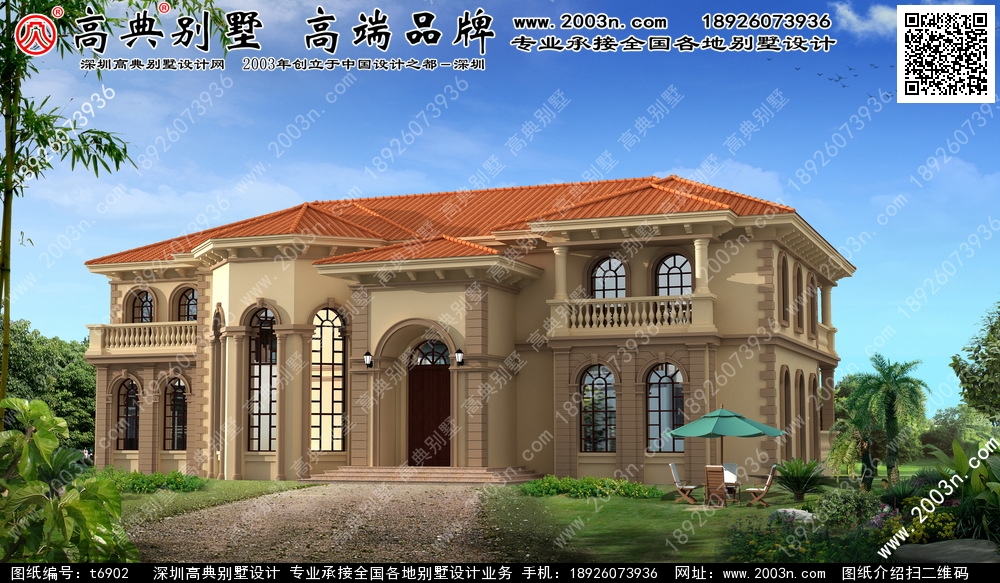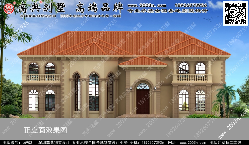 t6902号别墅外墙主要材料:外墙涂料、屋面S瓦、GRC水泥构件线条