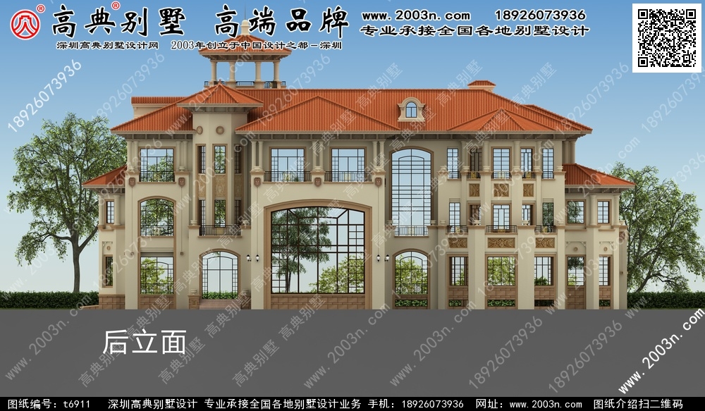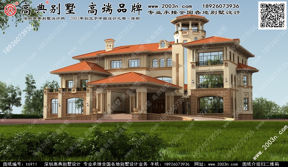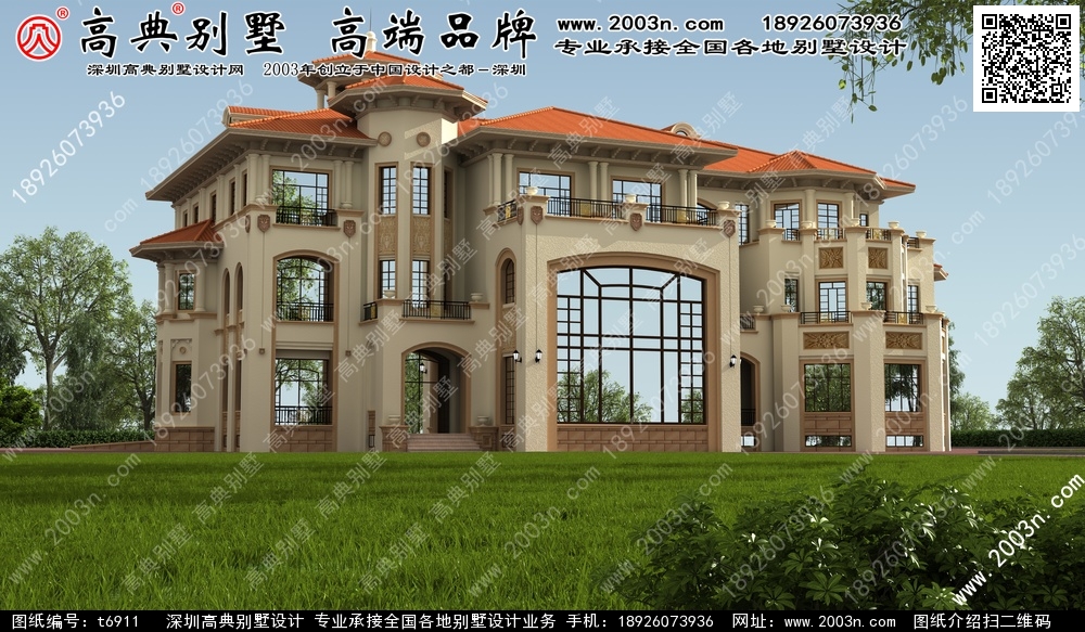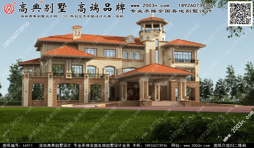 T6911号别墅外墙主要材料:砂岩石、真石漆、S瓦、水泥构件、铁艺栏杆