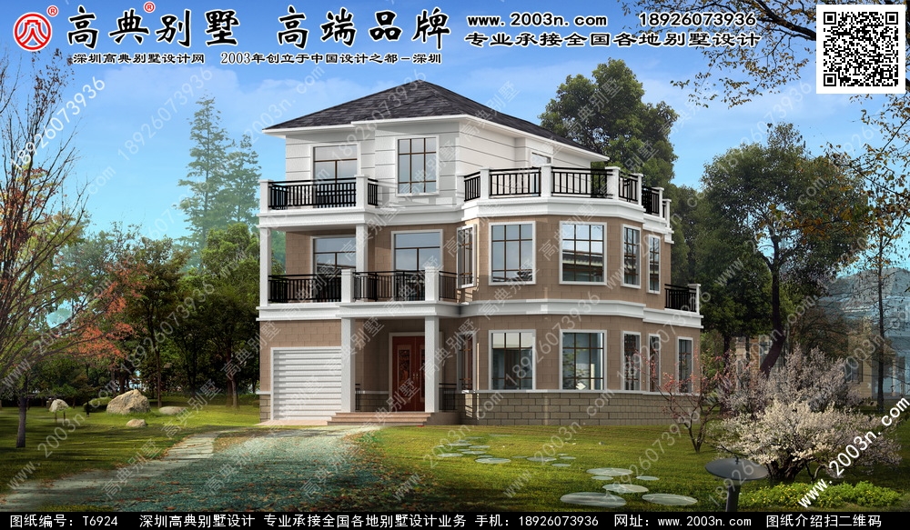 t6924号别墅外墙主要材料:外墙真石漆、屋面玻纤瓦、墙裙蘑菇石