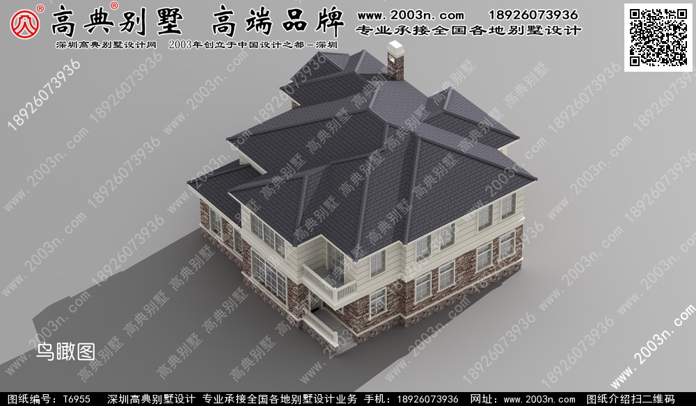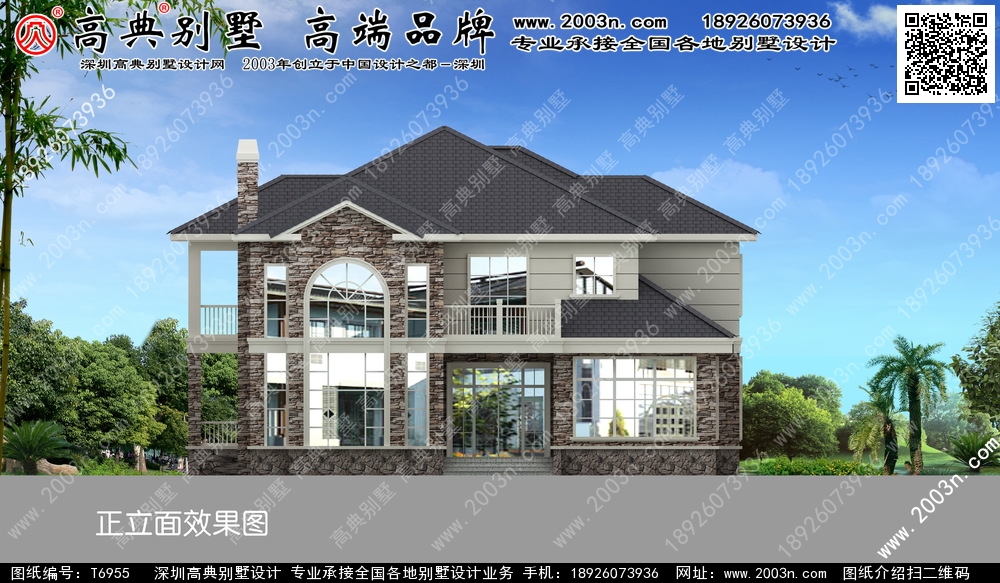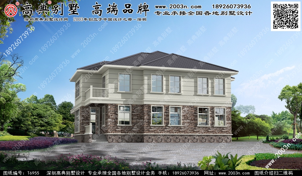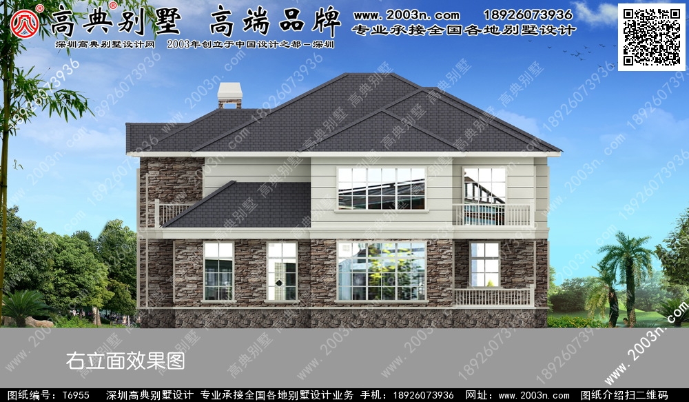 t6955号别墅外墙主要材料:外墙涂料、屋面水泥平板瓦、实木栏杆、外墙文化石
